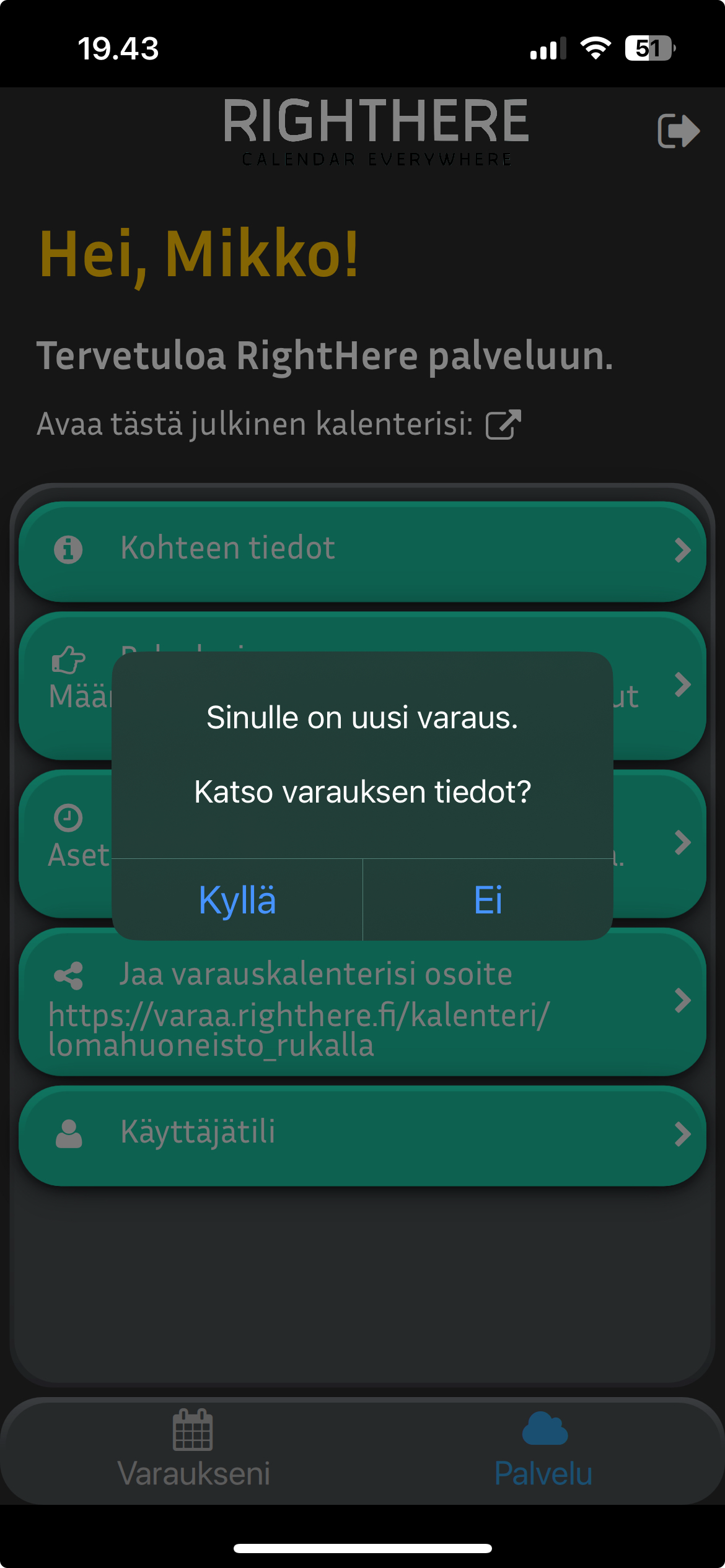 Aina uuden varauksen vastaanotettuasi saat siitä sähköpostin ja pop-up -viestin puhelimeesi. Vastaanottamasi varaukset saat näkyviin alapalkin kohdasta: ”Varaukseni”, joko lista tai kalenterinäkymänä. Painamalla varausta saat näkyviin tarkemmat tiedot.