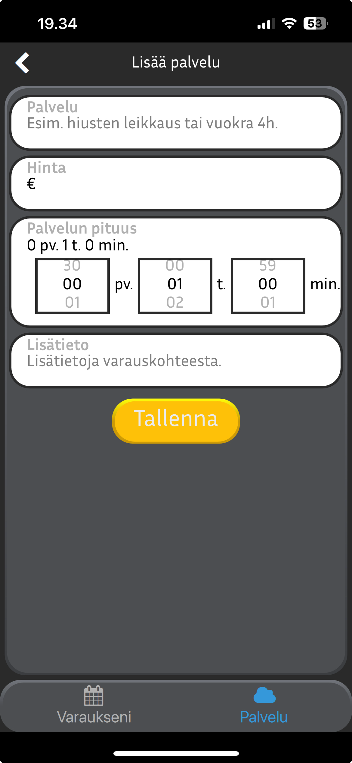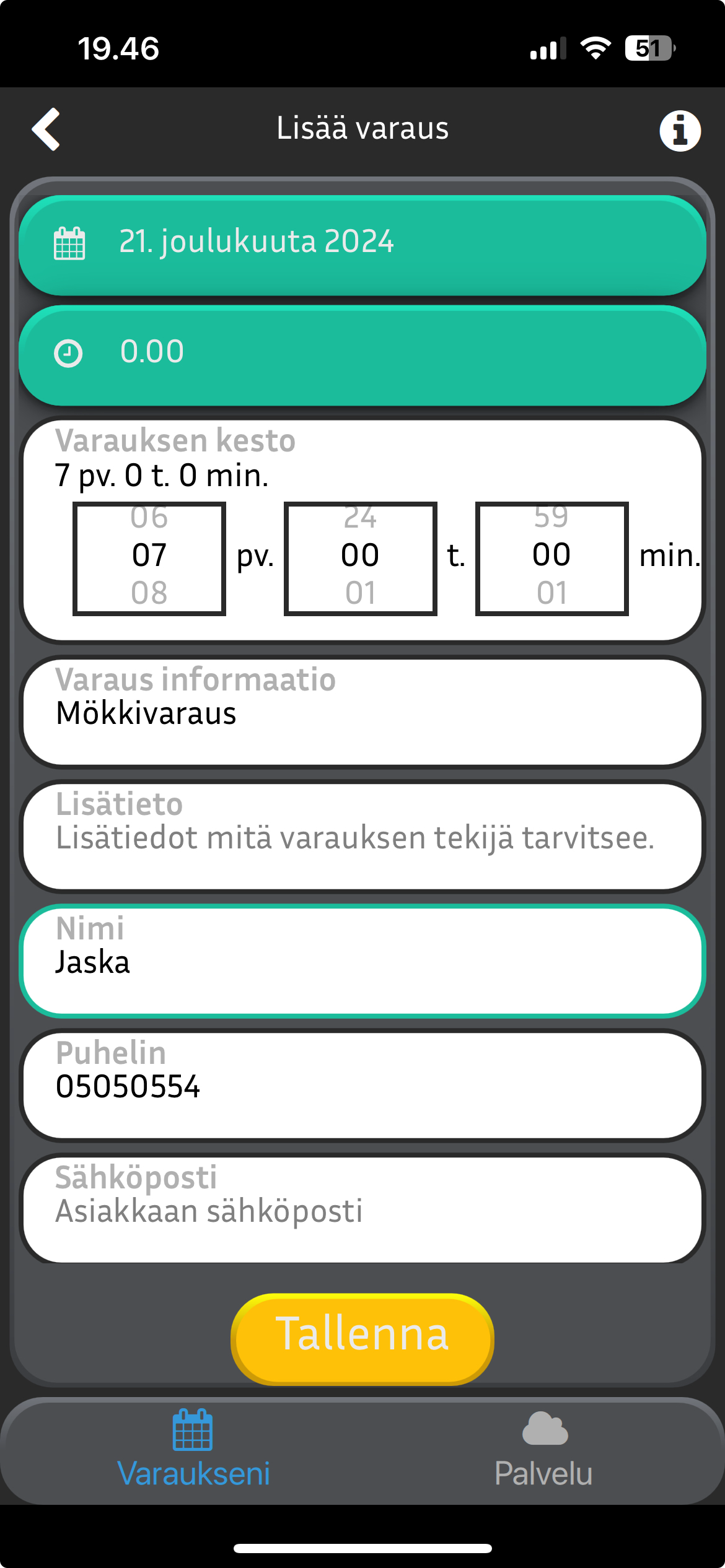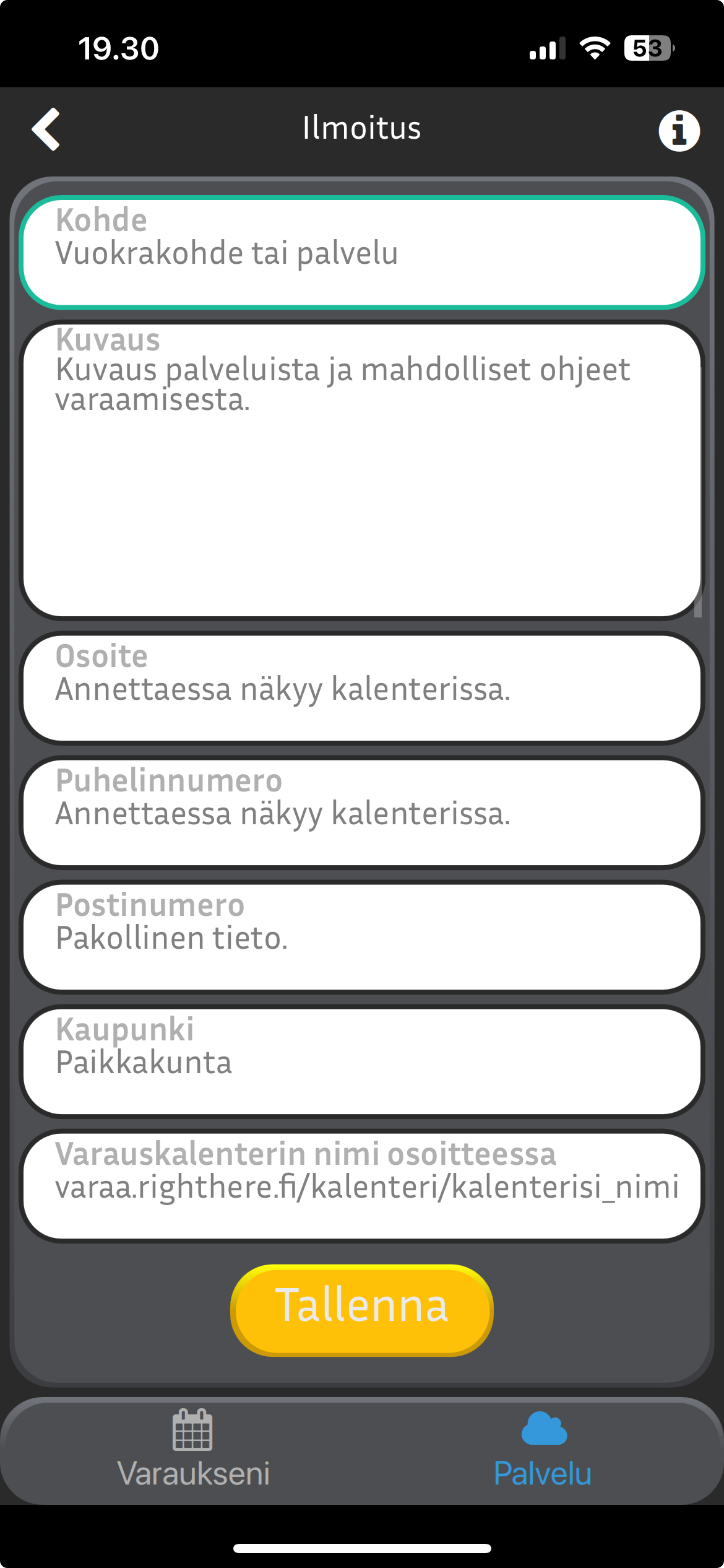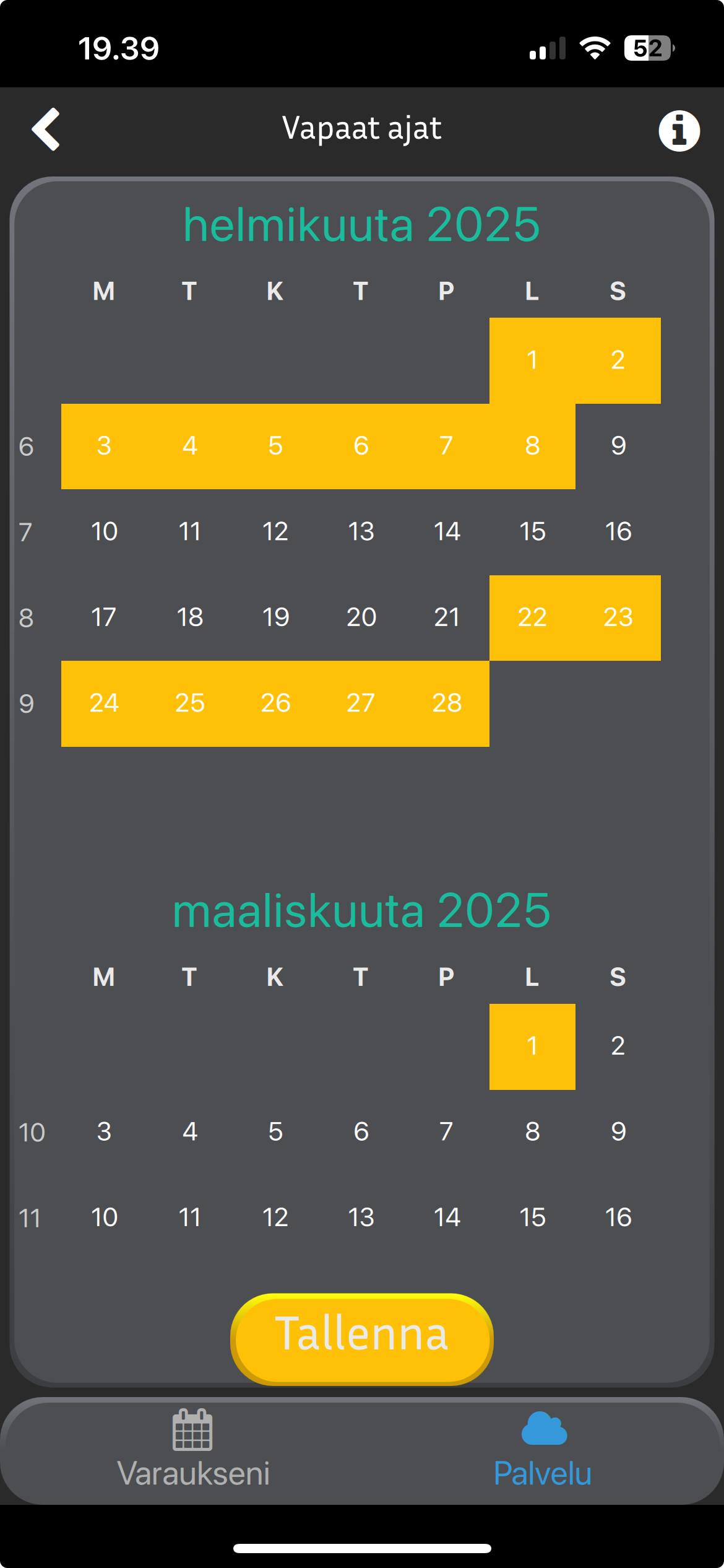 Ohje on avattavissa vasemman yläkulman i-painikkeen alta. Viimeistele varauskalenterisi valitsemalla ”Tallenna” ja palaa päänäkymään nuolipainikkeella.
