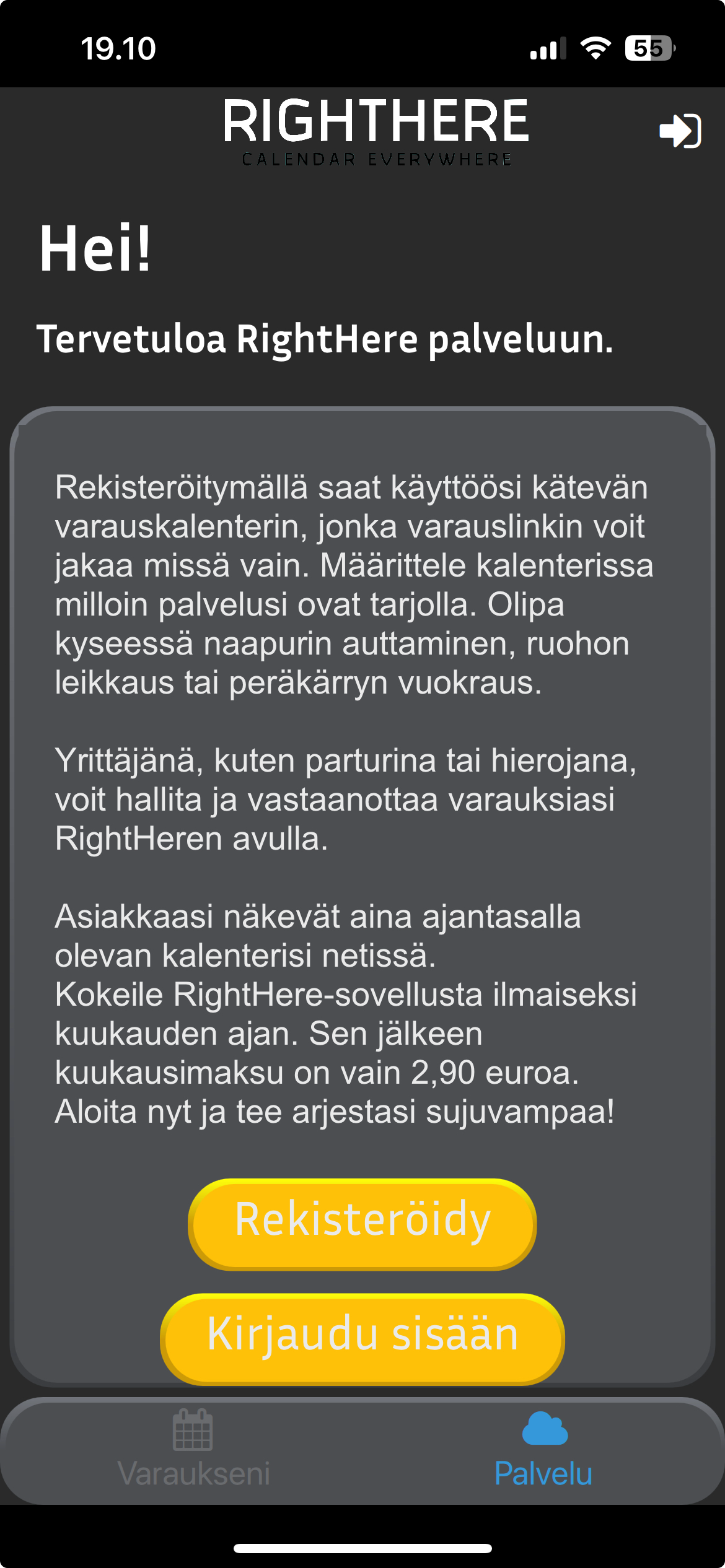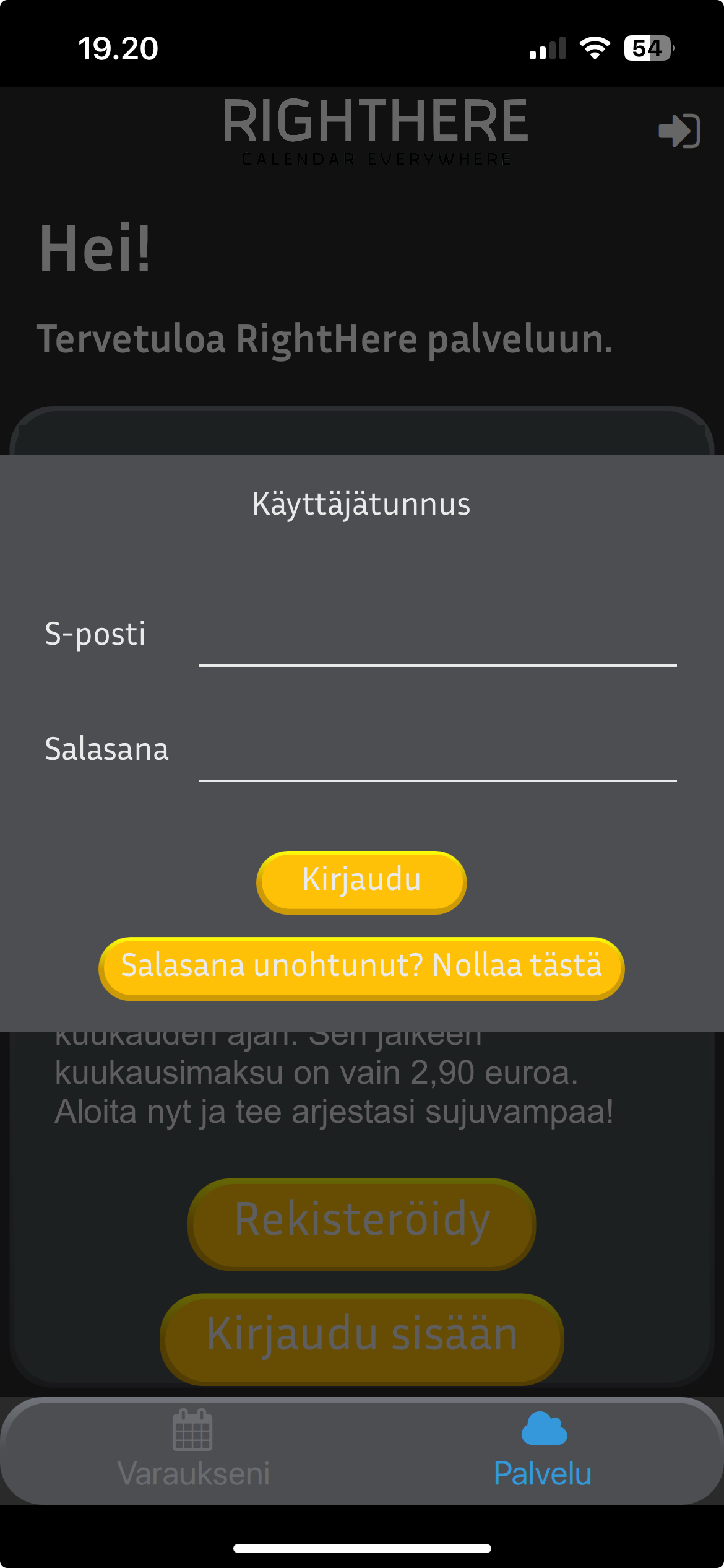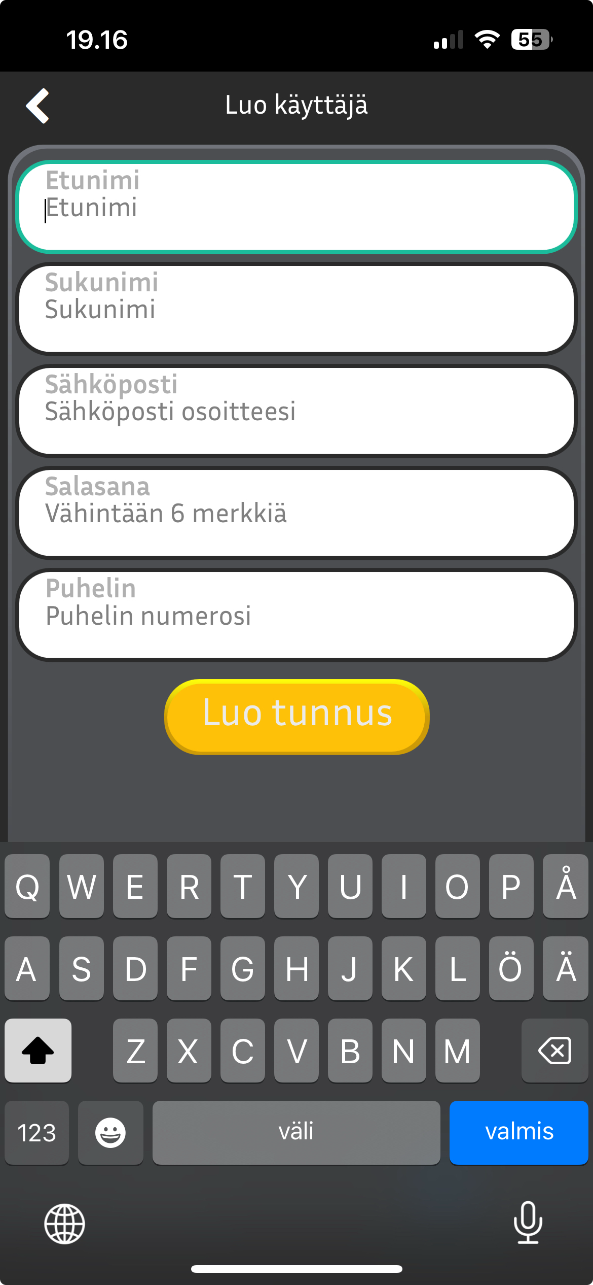 Anna tietosi sovellukselle ja luo käyttäjä. Sähköpostiosoitteesi toimii jatkossa käyttäjätunnuksenasi. Tiedot täytettyäsi saat sähköpostiisi vahvistuslinkin, jota klikkaamalla viimeistelet uuden käyttäjän luonnin.