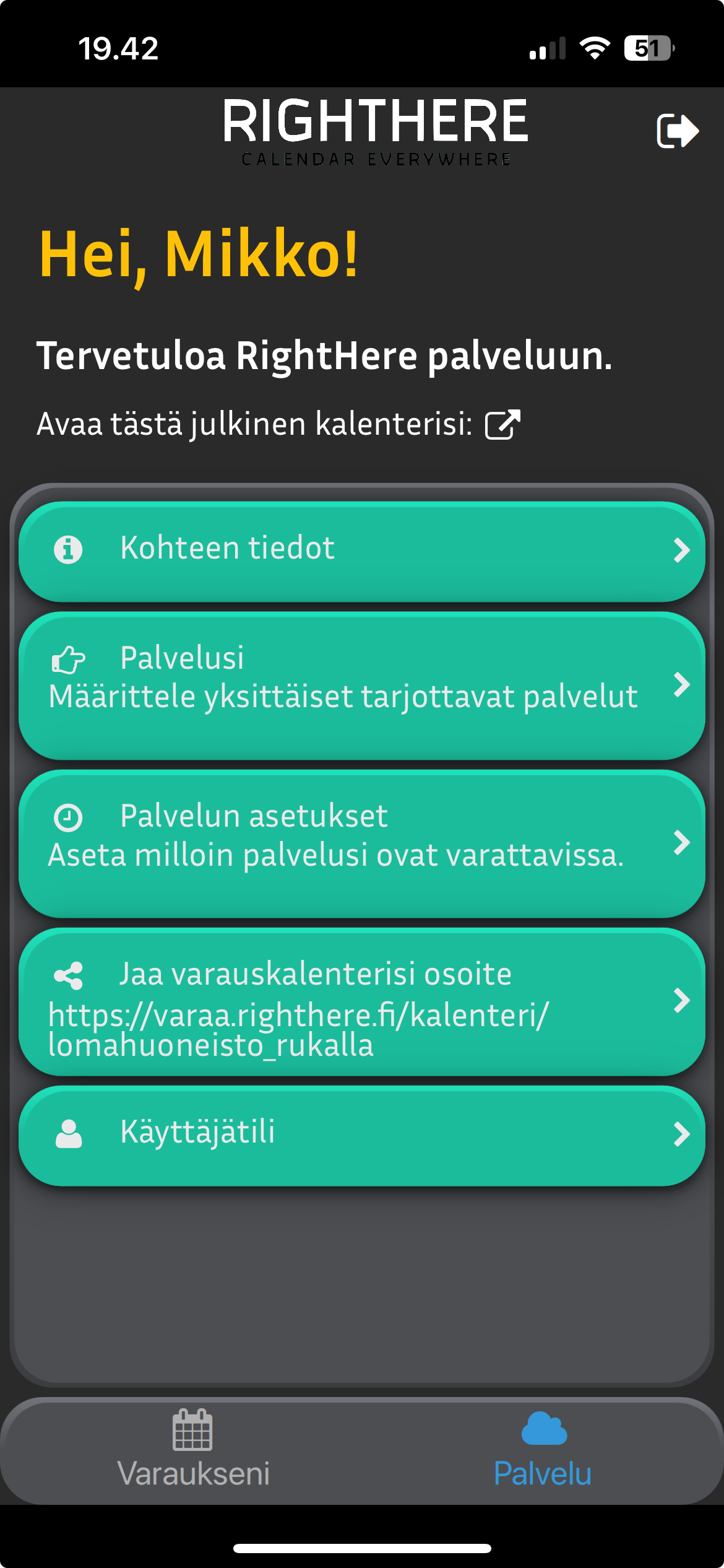 Valitsemalla pääsivulta ”Aloita tästä” pääset määrittelemään julkisessa kalenterissa näkyviä tietoja tarjottavasta palvelusta tai vuokrattavasta kohteestasi. Pääsivulle tulee uusia valikkoja edetessäsi käyttöönotossa.